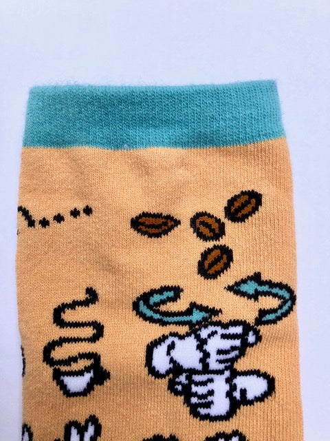 The perfect gift for Coffee lovers and ASL signers combined in one cozy comfy pair of socks. The ASL sign and fingerspelled word for "coffee" along with the word coffee and drawings of coffee beans, a coffee grinder and coffee cup all over the socks.