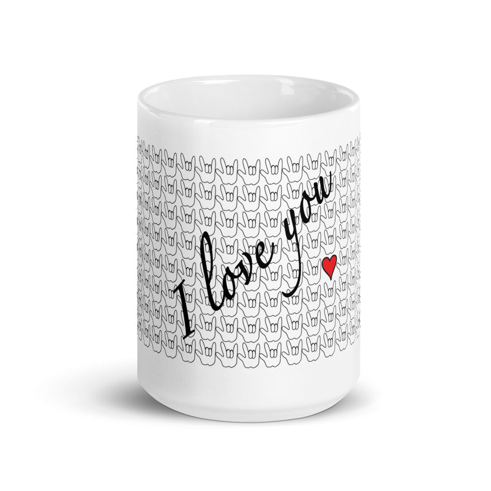Say "I Love You" in English and ASL. Rows of ASL "I Love You" hands fill the background with one red heart.