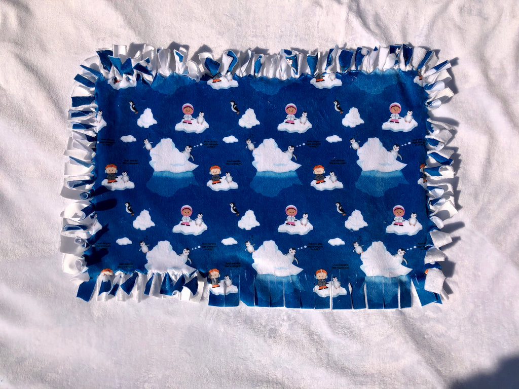 I made this design to explain how to sign "penguin" in ASL. I ordered a fat quarter to see how the design looks. (I have a shop at Spoonflower.com/profiles/marykane). I realized the black text is hard to see. (On Spoonflower - the text is now white - easier to read.) I didn't want this fabric to just sit in my studio doing nothing. And I'm not so great with the sewing machine. So I decided to try the knot type approach for blankets I learned from a video. Its a fat quarter - too small for a blanket - turns out it is a perfect size for a lumbar pillow. So here it is!