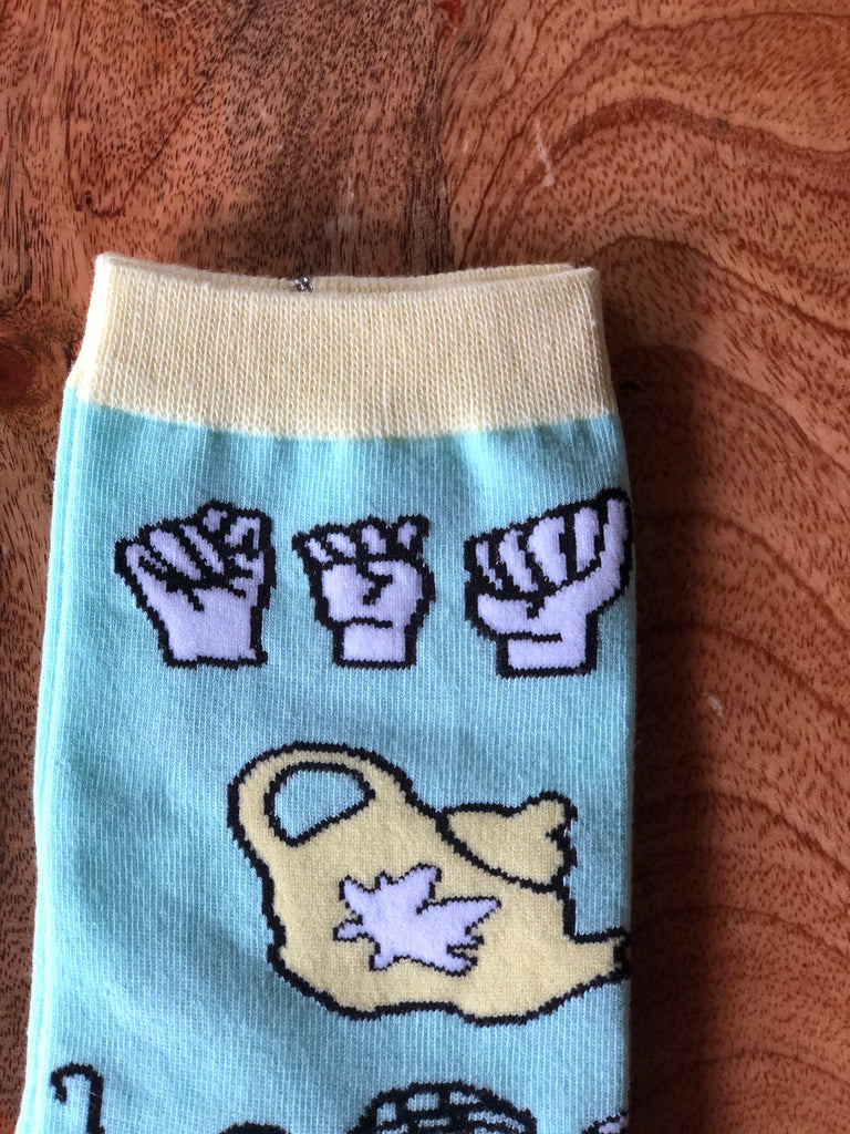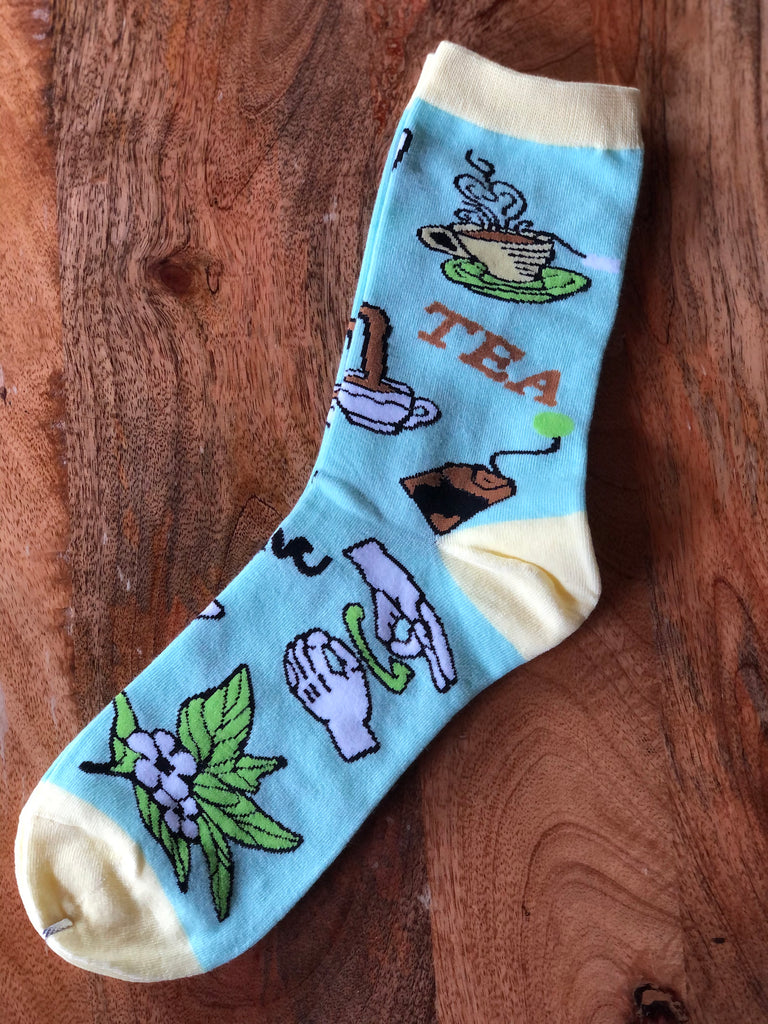 Tea lovers and ASL signers can cozy up in this pair of socks with a smile.