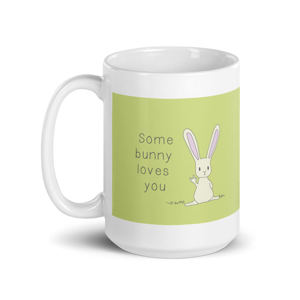 Cute gift for the person you love who knows ASL. One side has the bunny signing "I Love you" in ASL with the words "Some Bunny Loves You" next to it. On the back side are 4 little bunnies in the grass.