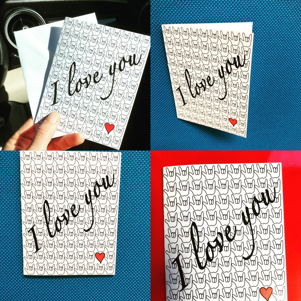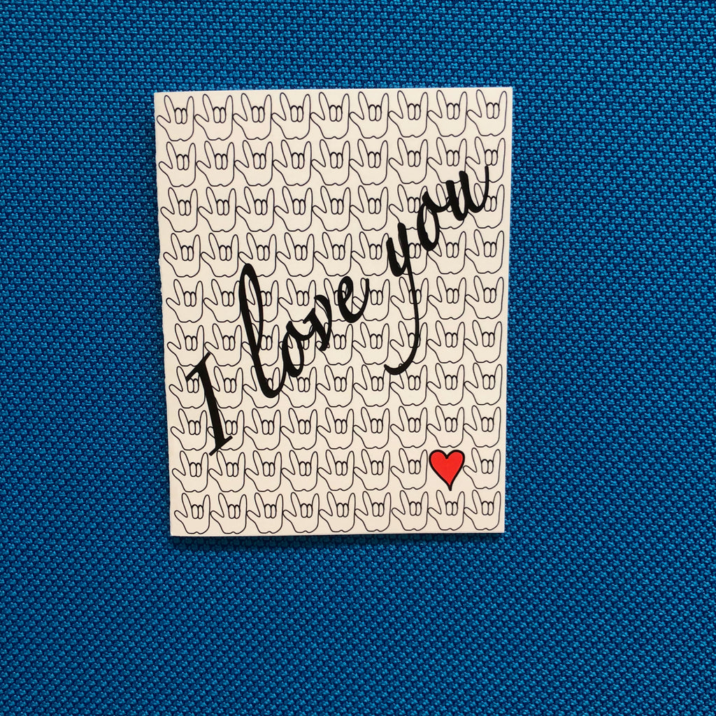 The background has rows and rows of the ASL "I Love You" handshape and across the front is a big splash of the words "I Love You" in a bold black script with a tiny red heart in the corner to complete the thought.