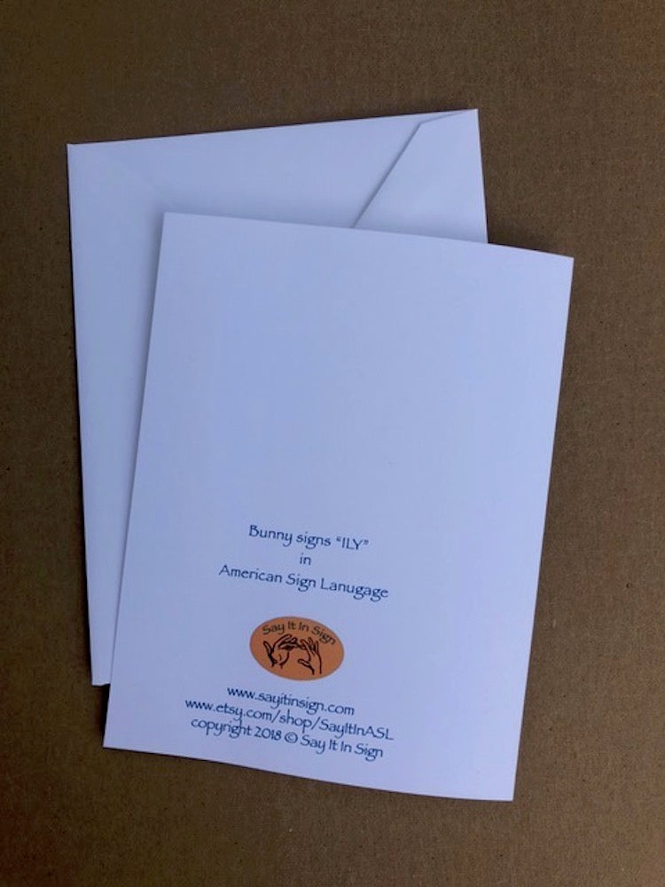 This is a cute play on words and I added the ASL "I love you" hand to the design. The card can be blank on the inside or I can add the words "Happy Easter". The card is printed on #80 classic card stock with an envelope.